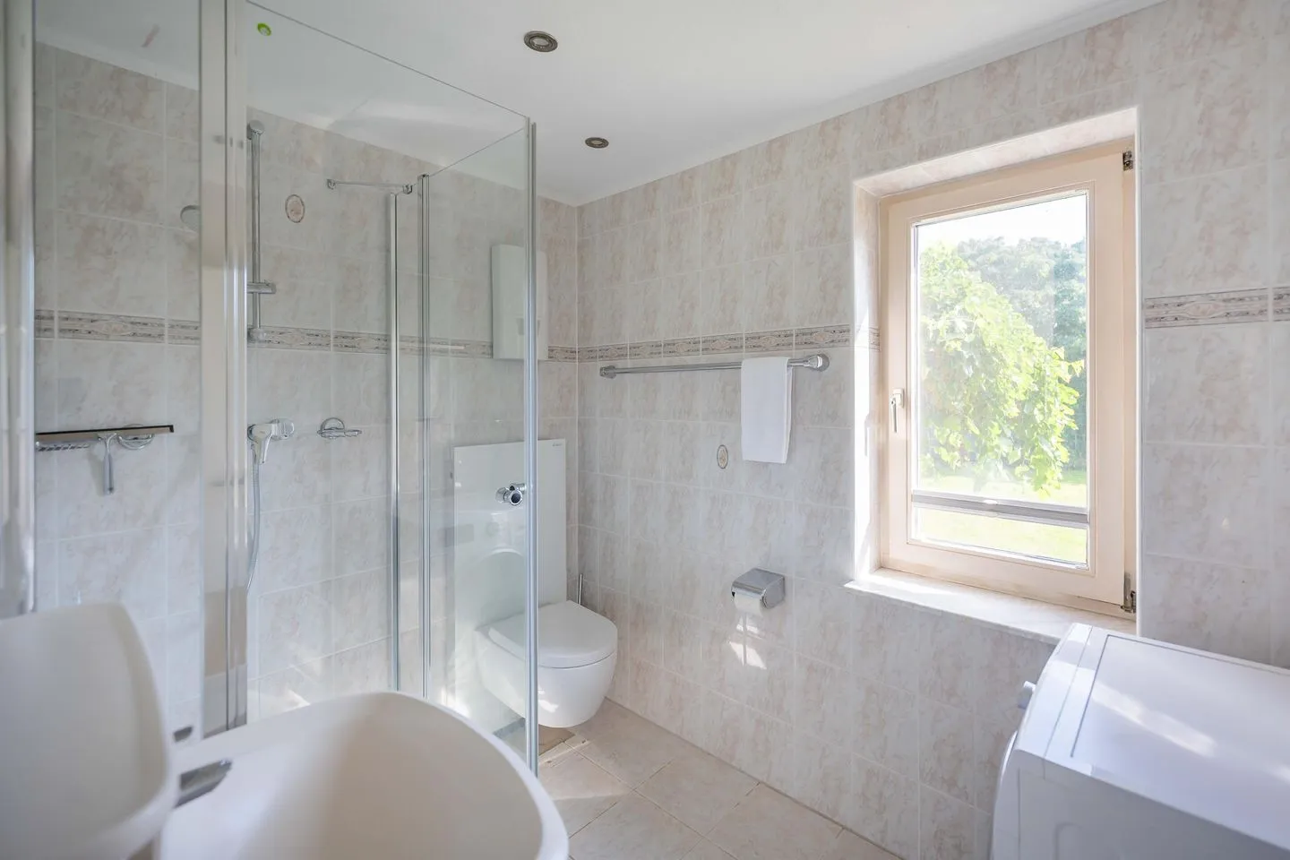 Im Erdgeschoss betreten Sie das Ferienhaus durch einen kleinen Eingangsbereich mit Garderobe. Der offene Wohn- und Küchenbereich ist das Herzstück des Hauses: Ein bequemes Ledersofa, Sessel, Fernseher und ein Kaminofen schaffen eine behagliche Atmosphäre – perfekt für gemütliche Abende; das Brennholz bringen Sie bitte selbst mit. Die offene Küche ist mit allem ausgestattet, was Sie für die Selbstverpflegung brauchen, inkl. Gefrierfach und Backofen. Ein kleiner Geschirrspüler übernimmt den lästigen Teil. Zahlreiche Fenster sind mit Insektenschutz versehen, sodass Sie auch an warmen Sommerabenden ungestört lüften können. Das Tageslichtbad mit Dusche, WC, Waschbecken, Handtuchheizkörper und Waschmaschine liegt separat am kleinen Flur. Im Erdgeschoss sind die Böden gefliest.